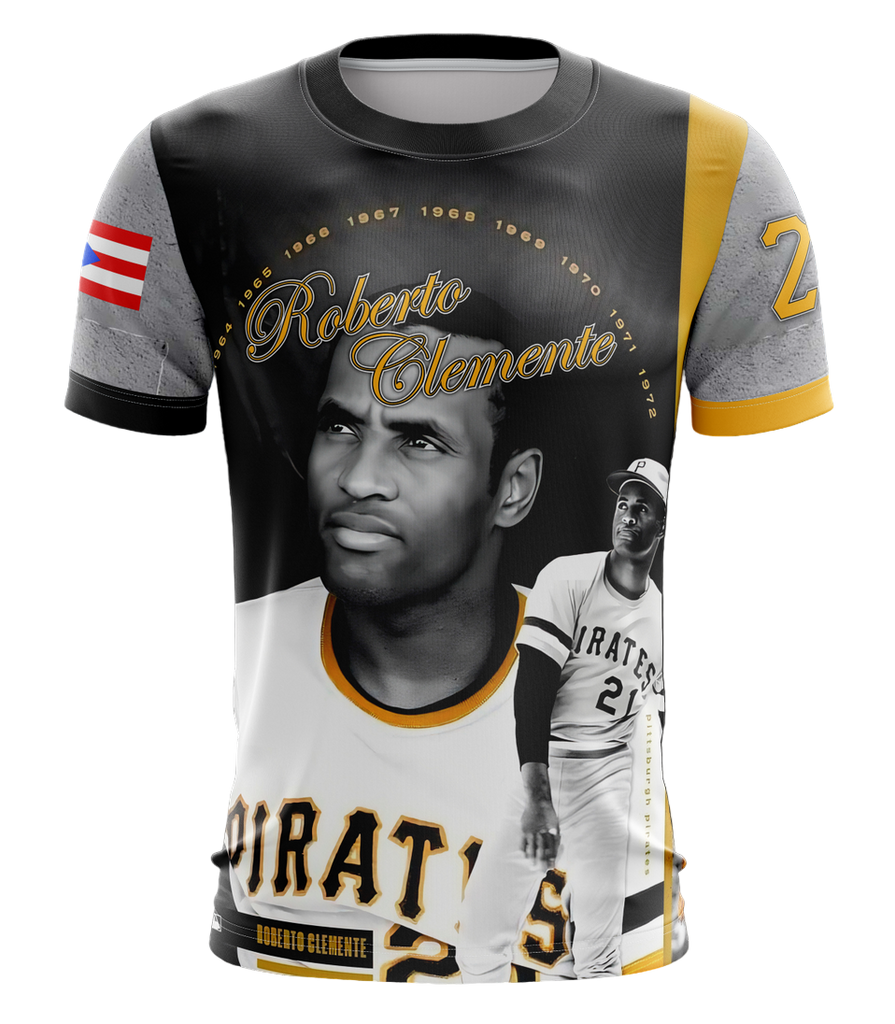 T-shirt with Roberto Clemente design featuring a portrait and baseball uniform.