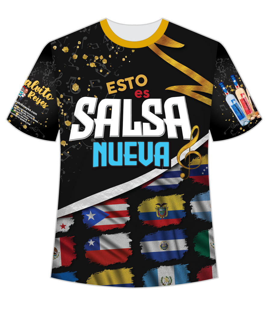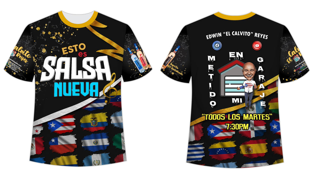 Para todo el fanático salsero le traemos la camiseta oficial de "Esto es Salsa Nueva" de nuestro embajador oficial "Edwin "El Calvito" Reyes. Esta camiseta es para el salsero de pura cepa que reconoce que la salsa está en su mejor momento. Ordena la tuya hoy mismo.