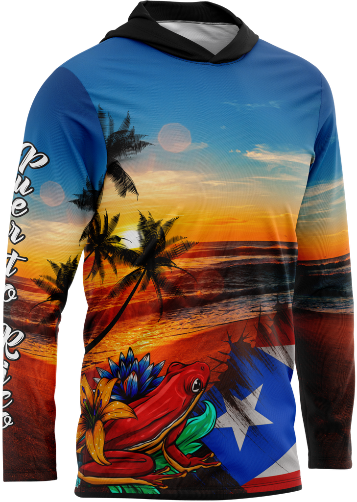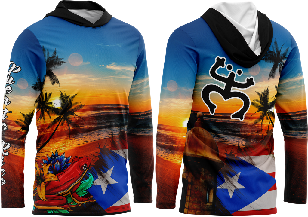 Nuestro nuevo diseño de la colección de camisetas de Puerto Rico con un hermoso amanecer y el coqui taino. Este hermoso diseño se destaca por las características que nos hacen recordar nuestras raíces Boricua. El bello amanecer, nuestra hermosa bandera y el coqui taino. Esta hoodie es perfecto para toda ocasión.