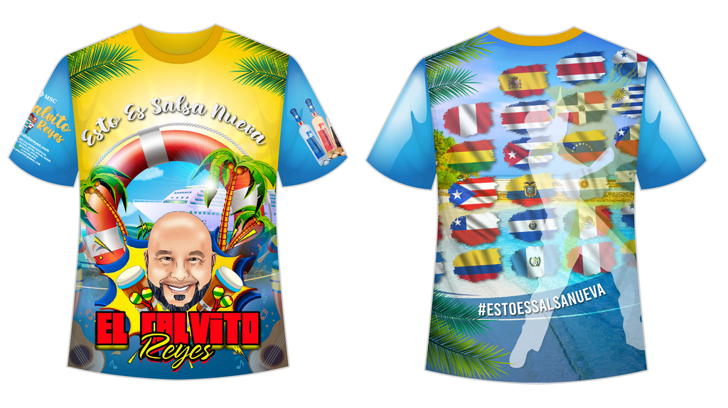 Nos acaba de llegar la camiseta oficial de la presentación de nuestro amigo “Edwin “El Calvito” Reyes en la edición 24 del Salsacruise del 2021. El Calvito deleitó a todos los bailadores no solo con su ritmo único y contagioso pero también con las camisetas con un diseño único.