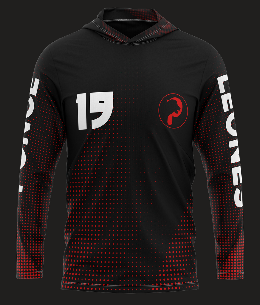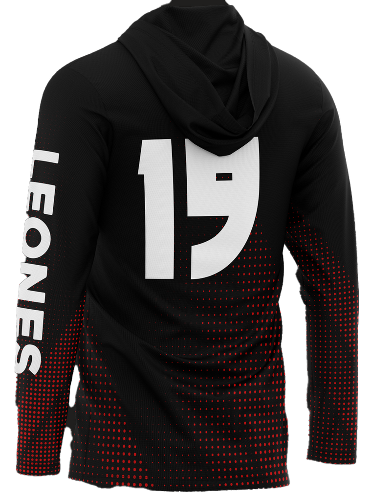 Black Leones hoodie with red dotted pattern, number 19, and lion head logo