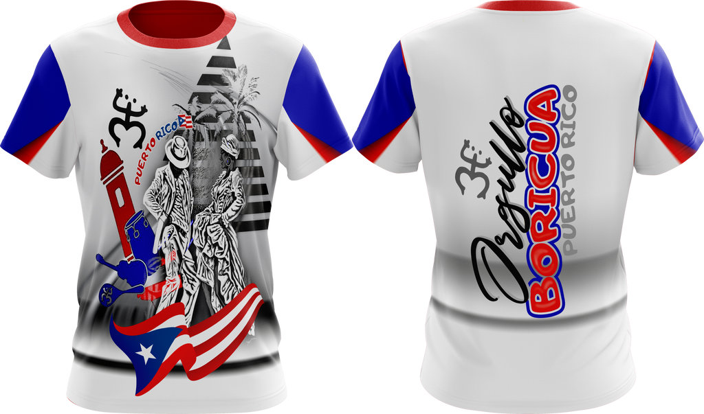 Nuestra camiseta "Orgullo Boricua" se destaca por las características que nos hacen recordar nuestras raíces Boricua. Ellas son el cuatro, las maracas y nuestra baile folklorico de Bomba y Plena.