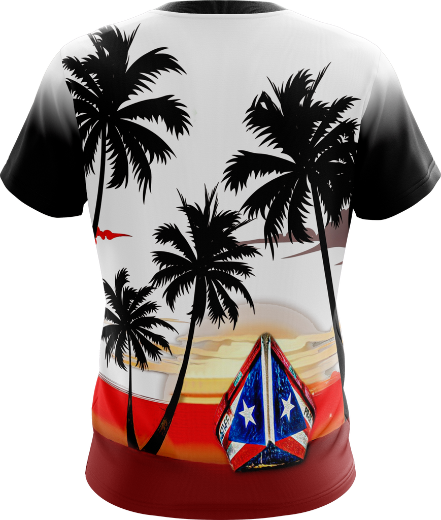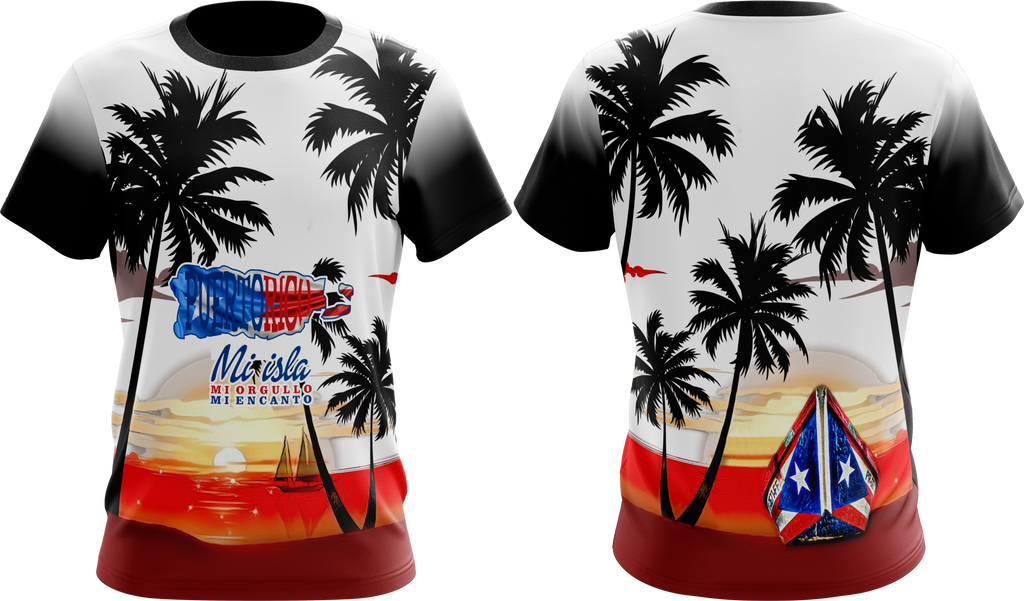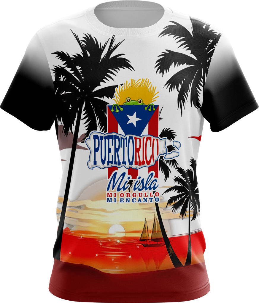 "Puerto Rico mi Isla" nos muestra una de las bellezas de nuestra Isla, sus atardeceres. Disenada completamente con nuestros atardeceres y lugar de relajamiento en mente. La camiseta es 100% polyester microfiber (Dry Fit) para mantenerte fresco en cualquier temperatura.